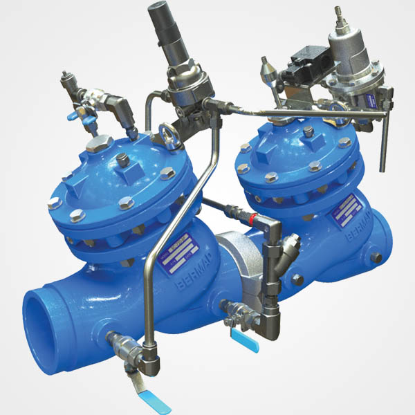 Sistema reductor de presión de operación hidráulica, accionado por diafragma, constituido por una PRV de BERMAD Modelo BC-720-P PRV y una válvula de respaldo integral. Este sistema reduce también la presión alta aguas arriba a una presión menor y constante aguas abajo, sin que le afecten las fluctuaciones en la demanda o en la presión aguas arriba. La válvula de respaldo permanece abierta en la operación normal gracias a su configuración de cámara doble, lo cual minimiza la pérdida de carga y maximiza el caudal a través de la válvula. Si la presión aumenta aguas abajo de la válvula BC-720-P de BERMAD por un desperfecto en la válvula, la válvula de respaldo responde rápidamente activando una alarma y proporcionando una presión estable a los consumidores hasta que se repare la PRV. En los sistemas de control de agua para edificios de BERMAD se combinan válvulas y elementos de control en una estructura integral y compacta que se ensambla y calibra en fábrica, destinada a llevar a cabo las tareas específicas del control de la conducción del agua. Estos sistemas ofrecen a los constructores e ingenieros soluciones sencillas y fáciles de instalar, inspeccionar y mantener.