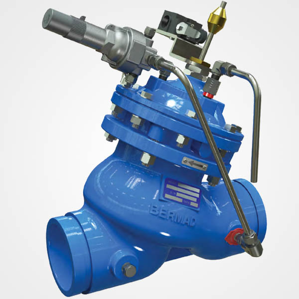Llave de cierre de operación hidráulica, accionada por diafragma, que se cierra herméticamente cuando la presión de entrada sube por encima del valor precalibrado. Responde de forma inmediata, precisa y altamente repetible a toda subida de presión en el sistema cerrándose completamente y emitiendo una alarma. Las válvulas de la Serie 700 de BERMAD son válvulas de control del tipo globo y están disponibles en diseño oblicuo estándar (Y) o angular. Tienen un cuerpo hidrodinámico para una trayectoria de flujo sin interferencias; el conjunto del asiento y actuador de cámara doble puede desmontarse fácilmente del cuerpo de la válvula como una pieza integral.